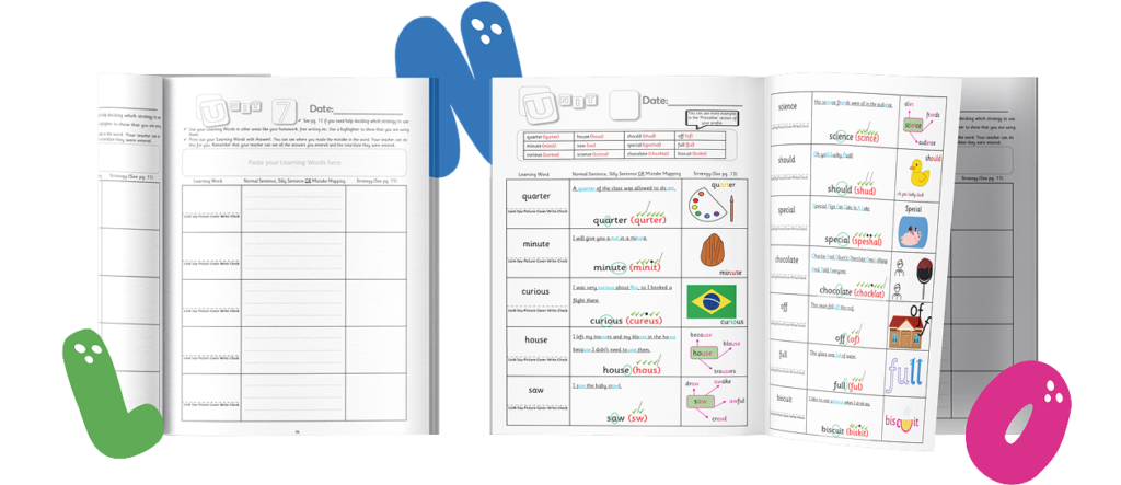 Examples of one unit in the Spellings For Me workbook. There are 30 units.
